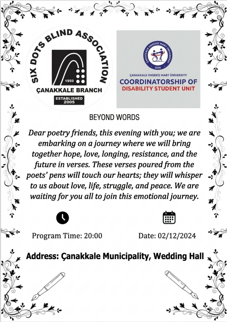 All academic and administrative staff, as well as our students, are cordially invited to the "Beyond Words" poetry recital. This now-traditional event is organized in collaboration with the Six Dots Blind Association Çanakkale Branch, the Youth Assembly, and the Çanakkale Onsekiz Mart University Disability Student Unit Coordination, as part of the December 3rd International Day of Persons with Disabilities.