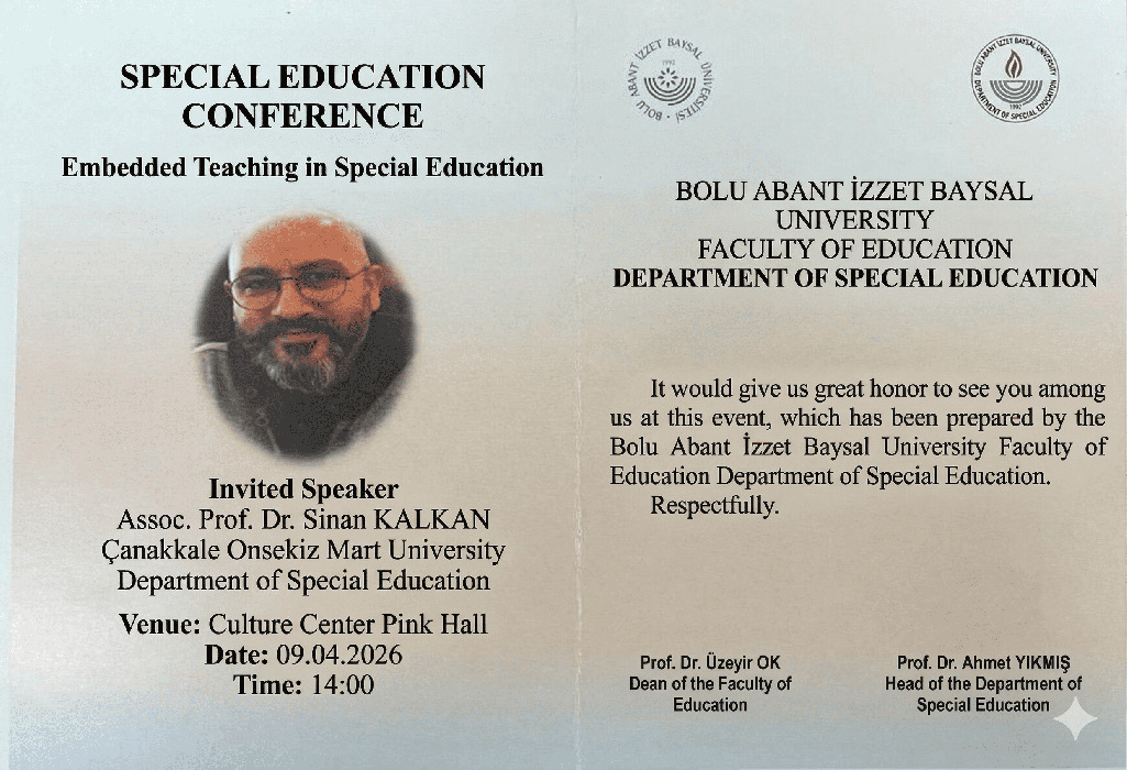 Assoc. Prof. Dr. Sinan KALKAN, from the Department of Special Education at Çanakkale Onsekiz Mart University, is cordially invited as a guest speaker to the event organized by the Bolu Abant İzzet Baysal University, Faculty of Education, Department of Special Education.