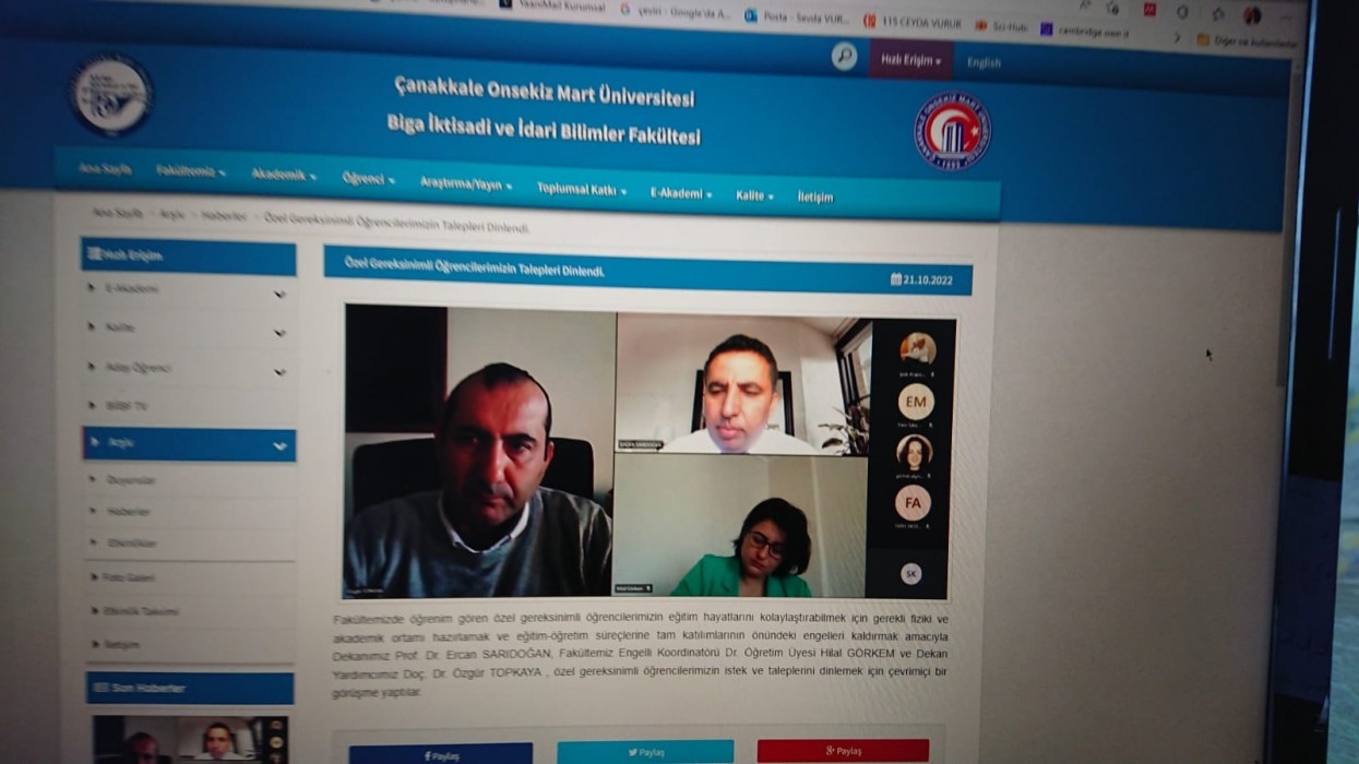 A meeting was organized via Microsoft Teams by our Dean Prof. Dr. Ercan SARIDOĞAN, Faculty Disability Coordinator Assist. Prof. Dr. Hilal GÖRKEM, and Vice Dean Assoc. Prof. Dr. Özgür TOPKAYA to listen to the requests and demands of our students with special needs. The goal of the meeting was to prepare the necessary physical and academic environment to facilitate the educational lives of our students with special needs and to remove barriers to their full participation in the teaching and learning processes.